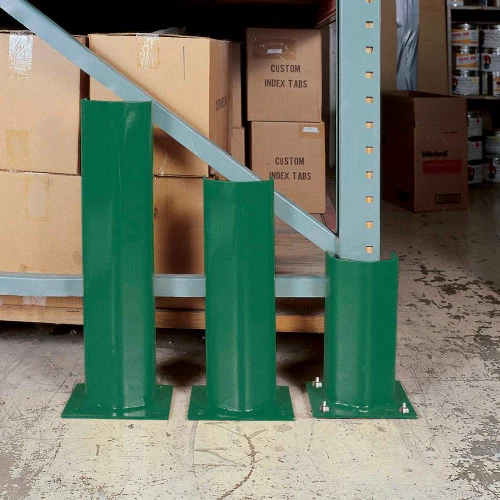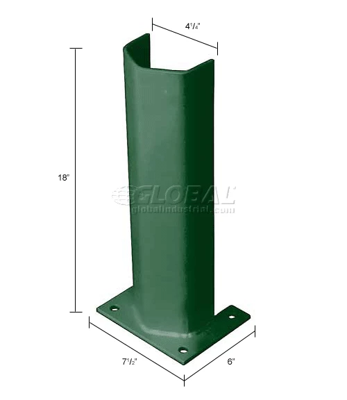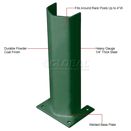 These post protectors serve as a pallet rack guard to improve plant safety and efficiency. The guards provide pallet rack protection and reduce building repairs due to accidental impact and collisions. Guards are made using heavy gauge steel with a durable powder coat finish. Units fit around rack posts up to 4″W. Includes four pre-drilled 9/16″ mount holes that allow floor anchoring for installation (hardware not included). Base plates measure 7-1/2″L x 6″W. Green color finish.