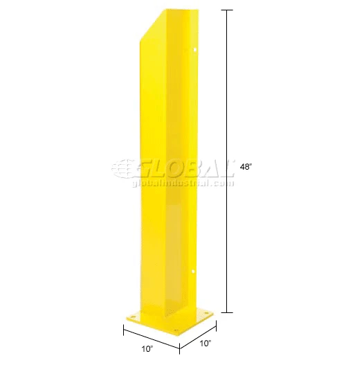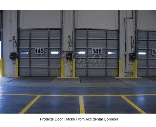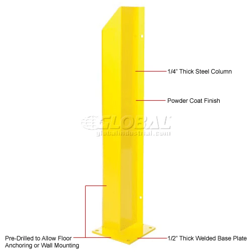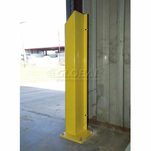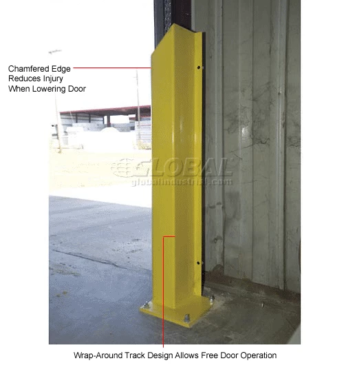 Door track protectors improve plant safety and efficiency by reducing insurance claims and building repairs due to accidental collisions. Chamfered edge reduces risk of hand injury when lowering door. Wrap-around track design allows free door operation. Made using heavyweight 1/4″ thick steel column with a 1/2″ thick welded base plate. Track guard projects 7″ from wall. 10″ x 10″ base plate allows floor anchoring with three pre-drilled 5/8″ diameter holes or can be mounted to walls (hardware not included). Powder coat finish.