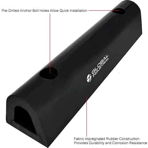 Protect loading docks from damage and the heavy impact of semi-trailers and trucks with the Global Industrial Extruded Rubber Fender Bumper. These extruded fender bumpers are made of durable, all-weather and abrasion-resistant rubber. Their half-oval shape allows for more effective protection of the fenders and cover a wide radius. A metal plate, located inside each bumper, adds additional support. Installation is easy with pre-drilled 7/8″ mounting holes. Installation hardware sold separately. 1-Year Limited Warranty.