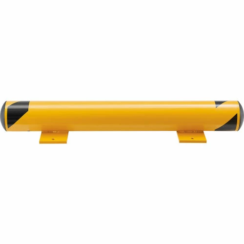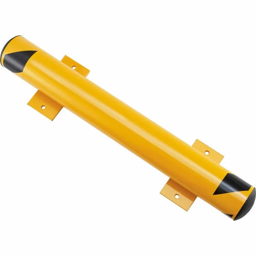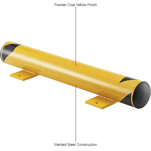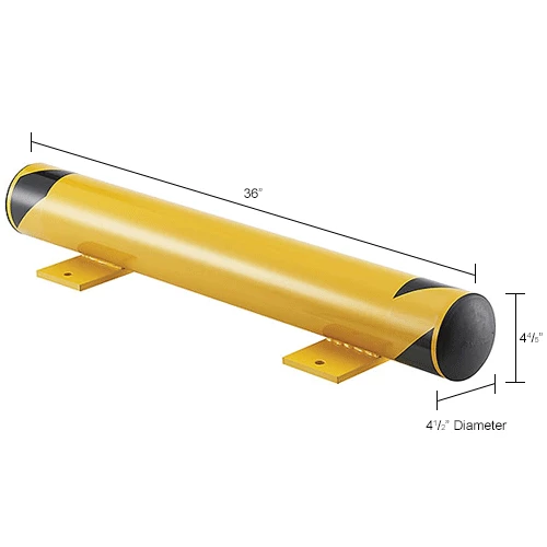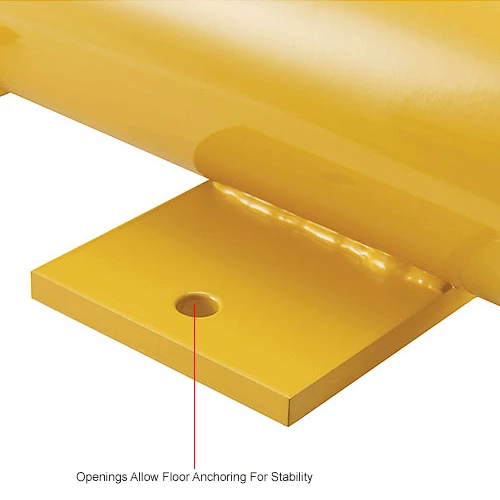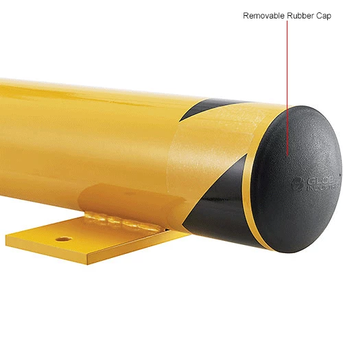 This Global Industrial Steel Floor Stop Bollard is used to control the flow of machinery like pallet jacks, forklifts, and carts and prevent them from accessing work areas or to prevent pedestrian and worker accidents. It is made from 4-1/2″ diameter heavy-duty welded steel with removable rubber end caps that allow the bollard to be filled with concrete for additional reinforcement for optimum strength and protection against hard impacts and crashes. Its base plates are pre-drilled to accept mounting bolts (sold separately – Hole Dimension 0.49”). The bollard has a high-visibility yellow powder coat finish with black stripes on edges. Overall length is 36″. 1 Year Limited Warranty.