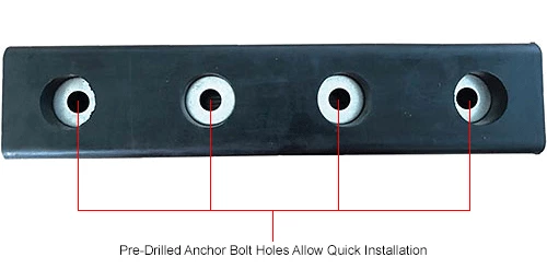 Hardened Molded Bumper is pre-drilled for quick installation. Bumper is constructed from fiber reinforced rubber containing nylon and polyester for added strength and durability. Steel reinforcement rings are molded into each Bumper and accept 3/4″ anchor bolts (hardware not included). Bumper projects 3″ from the surface. Sold individually. 1 Year Limited Warranty.