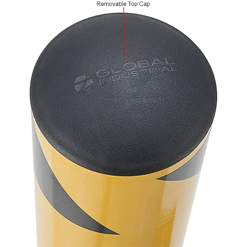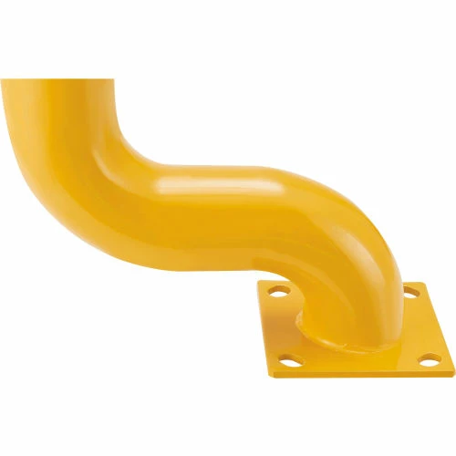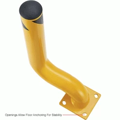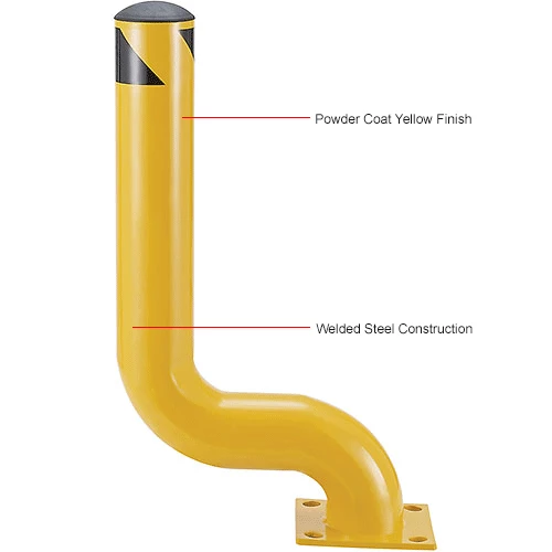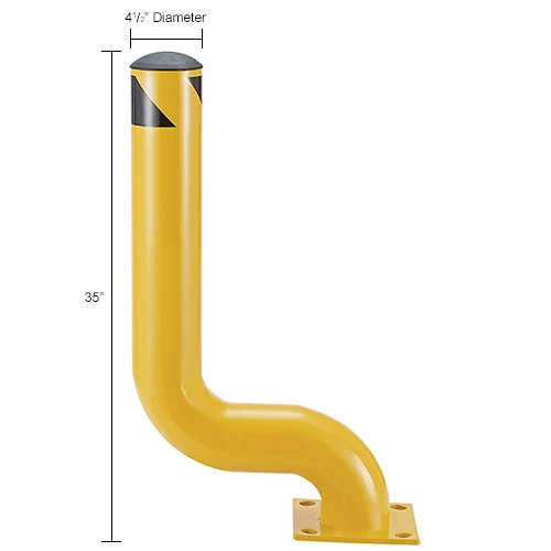 This 35″ tall Offset Steel Bollard has a design that places the base plate back from the bollard, so it won’t interfere with foot or machine traffic. The 8″ x 8″ base plate is 5/8″ thick and has four (4) pre-drilled mounting holes (mounting hardware is sold separately – Hole dimensions 0.866 x 1.18″). A removable plastic top cap and black/yellow safety tape are included. The bollard is made of heavy-duty welded steel construction with a safety-yellow powder coat finish. 35″H with a 4-1/2″ bollard diameter. 1 Year Limited Warranty.
