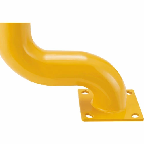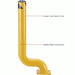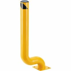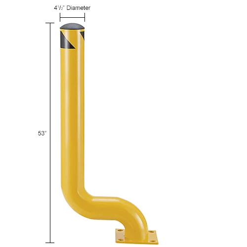 This 53″ tall Offset Steel Bollard has a design that places the base plate back from the bollard, so it won’t interfere with foot or machine traffic. The 8″ x 8″ base plate is 5/8″ thick and has four (4) pre-drilled mounting holes (mounting hardware is sold separately – Hole dimension 0.866 x 1.18″). A removable plastic top cap and black/yellow safety tape are included. The bollard is made of heavy-duty welded steel construction with a safety-yellow powder coat finish. 53″H with a 4-1/2″ bollard diameter. 1 Year Limited Warranty.