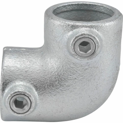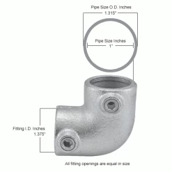 90 Degree Elbow Pipe Fitting is used to make a 90 degree connection between straight lengths of pipe. Elbow pipe fitting is typically found as an end joint when building pipe hand railing, guard rail or other pipe-based structures. Elbow joint is durably constructed from galvanized iron for corrosion resistance and long lasting strength. Fitting locks onto 1″ diameter pipe with hardened set screws (included) for secure connection. Anchor hole is slightly larger than ½” diameter.