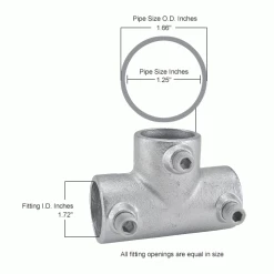 90 Degree Three Socket Tee Pipe Fitting joins a top rail and an intermediate upright in hand rail or safety rail configurations. Durably constructed with galvanized iron for corrosion resistance and low long term maintenance. Fitting locks onto 1-1/4″ diameter pipe with hardened set screws (included) for secure connection. Anchor hole is slightly larger than ½” diameter.
