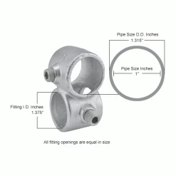 Crossover Pipe Fitting utilizes continuous horizontal rail instead of cut pipe for cost savings. Used in railings, safety barriers and racks, crossover pipe fittings may also give intermediate rails when horizontal ties between uprights is not required. Durably constructed with galvanized iron for corrosion resistance and low long term maintenance. Fitting locks onto 1″ diameter pipe with hardened set screws (included) for secure connection. Anchor hole is slightly larger than ½” diameter.