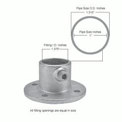 Medium Flange Pipe Fitting is commonly used to mount a 1″ diameter horizontal pipe to the wall. Durably constructed with galvanized iron for corrosion resistance and low long term maintenance. Pipe is joined to flange with hardened set screws for secure placement. Anchor hole is slightly larger than ½” diameter.