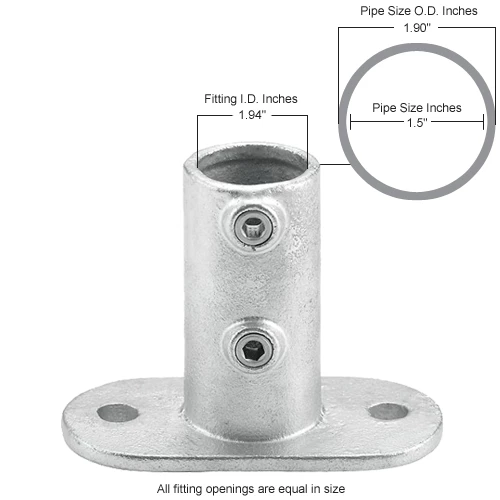 Global Pipe Fitting – Rail Flange 1-1/2″ Diameter Rail Flange Pipe Fitting is commonly used to mount hand rail, guard rail or other pipe-based structures to the floor. Durably constructed of galvanized iron to provide maximum corrosion resistance and long lasting durability. Rail flange includes two hardened set screws in the vertical socket for greater side load stability. For safe installation, flange fixing holes should be in line with the applied load. For 1-1/2″ diameter pipe. Anchor hole is slightly larger than ½” diameter.