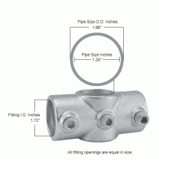 Two Socket Cross Pipe Fitting joins a middle rail and an intermediate upright in hand rail or safety rail configurations. Upright passes through the two socket cross for precise placement of the middle rail. Durably constructed with galvanized iron for corrosion resistance and low long term maintenance. Fitting locks onto 1-1/4″ diameter pipe with hardened set screws (included) for secure connection. Anchor hole is slightly larger than ½” diameter.