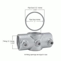 Two Socket Cross Pipe Fitting joins a middle rail and an intermediate upright in hand rail or safety rail configurations. Upright passes through the two socket cross for precise placement of the middle rail. Durably constructed with galvanized iron for corrosion resistance and low long term maintenance. Fitting locks onto 1″ diameter pipe with hardened set screws (included) for secure connection. Anchor hole is slightly larger than ½” diameter.