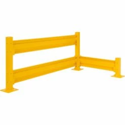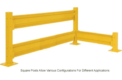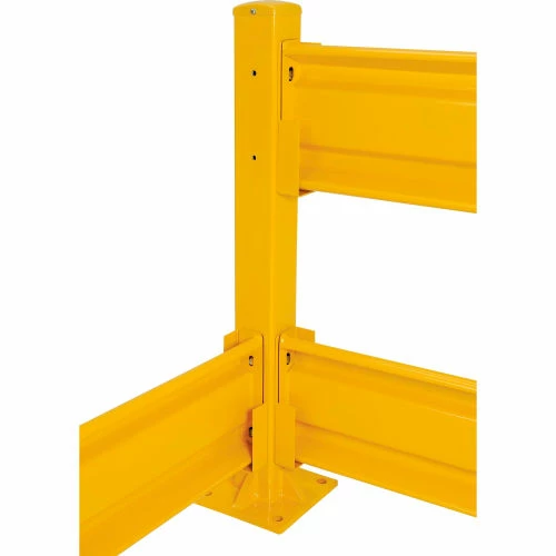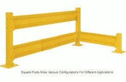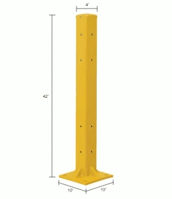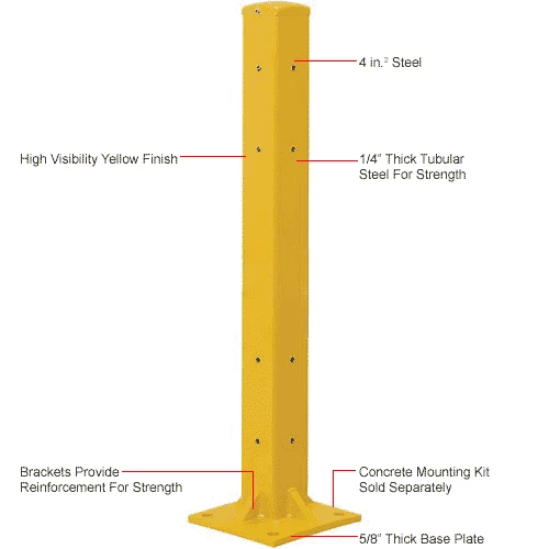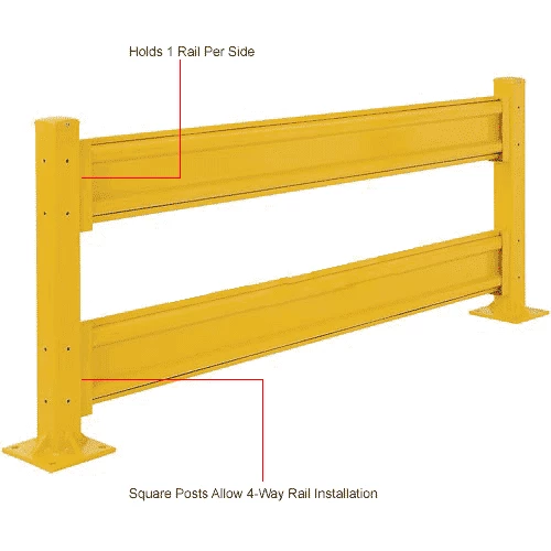 The Global Industrial Protective Guard Rail Post For Double Rail models are ideal for creating complete guard rails systems around stations, walls, or other locations that need protection from forklift traffic. The 42″H guard rail post supports 2 barrier rails. Highly visible safety yellow finish. These 4″ sq. x 1/4″ thick tubular 5 gauge steel posts are sold individually. Install the Optional Drop-In Brackets (sold separately) to post to allow easy, tool-free, rail installation by simply sliding them into place. To support a single rail, choose the 18″H Post. Each post increases overall length by 4″. This has identical holes on all 4 sides.