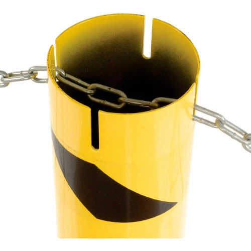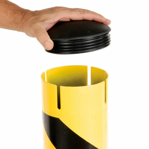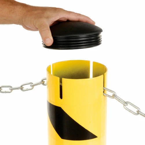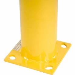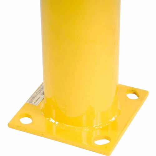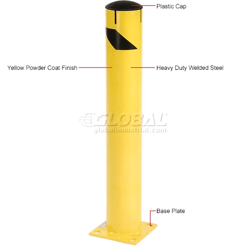 The heavy duty steel welded construction makes these traffic bollards ideal for protecting personnel, racking and machinery indoors or out. Topped with a removable plastic cap, bollards can be filled with concrete for reinforcement. Base plates include 4 openings for mounting bolts (sold separately). High visibility yellow powder coat finish. This style is designed to install on existing concrete floors.