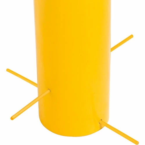 The heavy duty steel welded construction makes these traffic bollards ideal for protecting personnel, racking and machinery indoors or out. Topped with a removable plastic cap, bollards can be filled with concrete for reinforcement. Slide through lag anchors, assembly requires. High visibility yellow powder coat finish. This style is designed to be installed underground or poured into place in fresh concrete. When installed into cement or ground, max. height is 38″.
