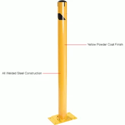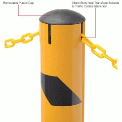Provide protection for heavy duty machinery and designate where industrial vehicles cannot enter with the Global Industrial Steel Bollard with Chain Slots & Removable Cap. This bollard is ideal for protecting doorways, corners, and industrial equipment. All welded steel construction. Safety yellow powder coat finish provides strong visibility.