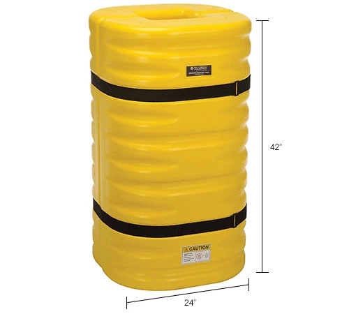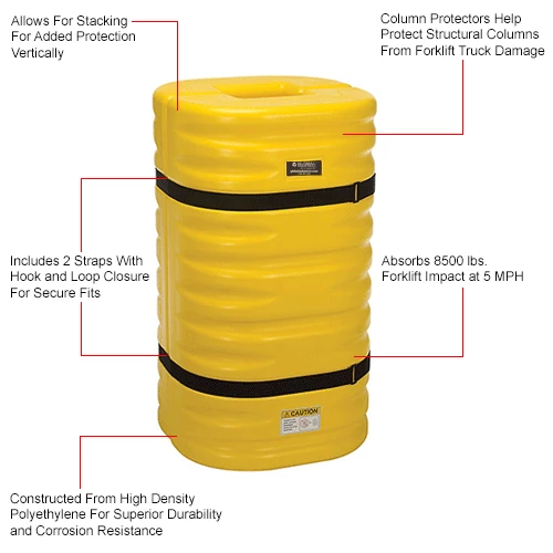 Protect columns in your facility with the Global Industrial™ Yellow Column Protector, which provides strong impact-resistance for facilities where vehicles transport materials for storage, distribution, and more. Each column protector is made of high-density polyethylene and are designed to absorb forklift and tow-motor impacts, minimizing column and machinery damage, and preventing personnel injury. Includes 2 black straps for installation ease. Color finish is Yellow.