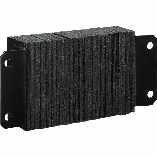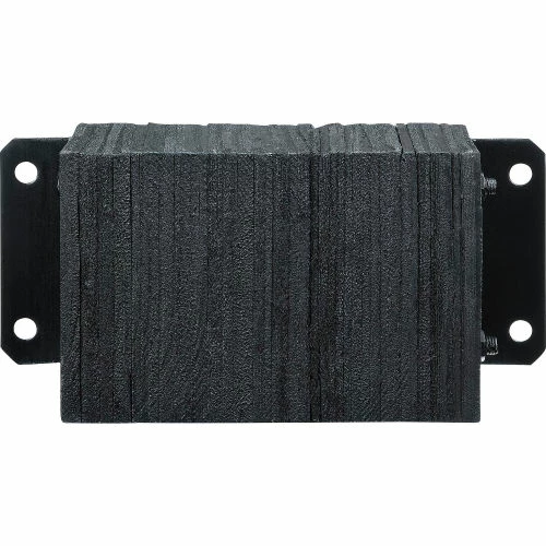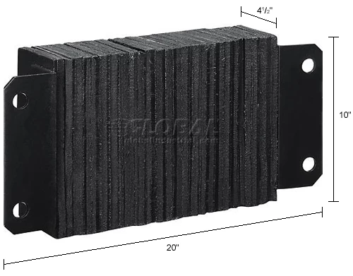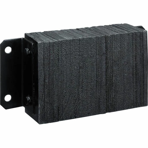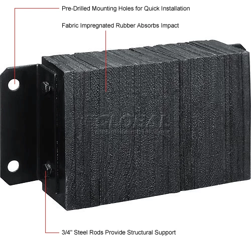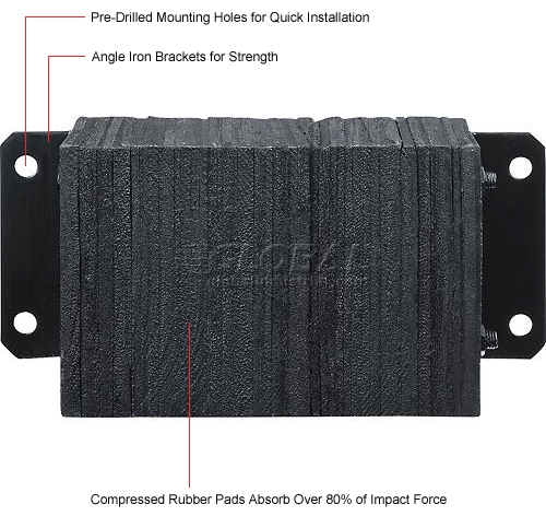 Tough plies of fabric impregnated rubber pads are compressed and secured by 3/4″ thick steel rods and mounted to 1/4″ thick angle iron brackets. Absorbs over 80% of the impact force. Pre-drilled 13/16″ anchor bolt holes offer quick installation. Allow 12″ between each bumper for dependable protection.
