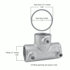 90 Degree Three Socket Tee Pipe Fitting joins a top rail and an intermediate upright in hand rail or safety rail configurations. Durably constructed with galvanized iron for corrosion resistance and low long term maintenance. Fitting locks onto 1-1/2″ diameter pipe with hardened set screws (included) for secure connection. Anchor hole is slightly larger than ½” diameter.