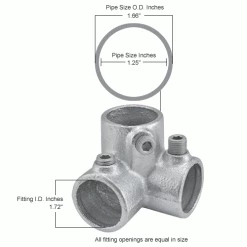 Side Outlet Elbow Pipe Fitting provides a three way joint when building pipe hand railing, guard rail or other pipe-based structures. Typically found on the top hand rail, a side outlet elbow can also be used as a corner joint for benches, work tables or other rectangular structures. Strong iron material includes a galvanized finish for corrosion resistance and long term use. Fitting locks onto 1-1/4″ diameter pipe with hardened set screws (included) for secure connection. Anchor hole is slightly larger than ½” diameter.