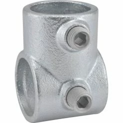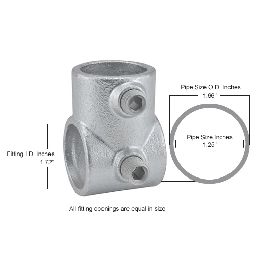 Single Socket Tee Pipe Fitting is used to join two pipes together at a 90 degree angle when building pipe hand railing, guard rail or other pipe-based structures. Single Socket Tee is made from galvanized iron for corrosion resistance and long lasting strength. Fittings lock onto 1-1/4″ diameter pipe with hardened set screws (included) for secure connection. Anchor hole is slightly larger than ½” diameter.
