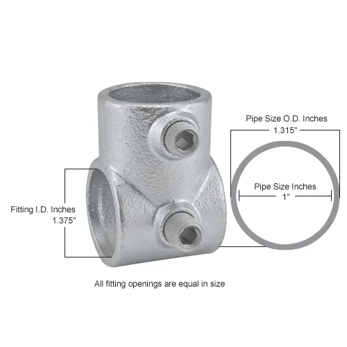 Single Socket Tee Pipe Fitting is used to join two pipes together at a 90 degree angle when building pipe hand railing, guard rail or other pipe-based structures. Single Socket Tee is made from galvanized iron for corrosion resistance and long lasting strength. Fittings lock onto 1″ diameter pipe with hardened set screws (included) for secure connection. Anchor hole is slightly larger than ½” diameter.