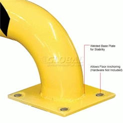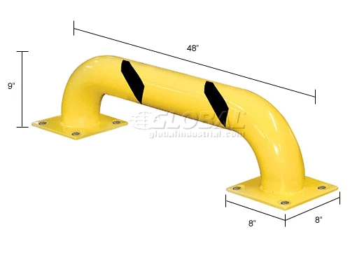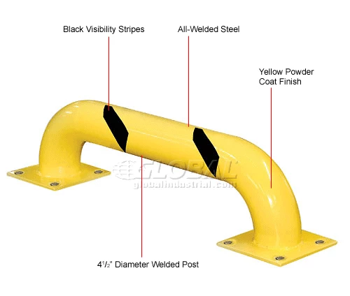 Guards configured in 3 styles protect warehouse, parking and loading areas. These 9″H Low Profile guards provided protection for pallet racks, machinery and personnel. All welded steel construction measures 4-1/2″ diameter. Base plates measure 8″ x 8″ square. Safety yellow powder coat finish with black visibility stripes. Hardware is not included.