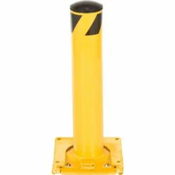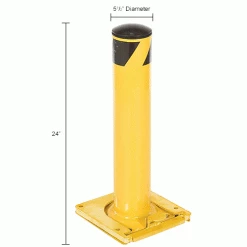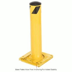 Steel safety bollards feature a detachable base plate design that allows quick and easy guard removal. Removable plates feature a pull-out side that allows the rack or bollard to slide out of mounted position temporarily to provide full access to machines, racks, loading docks, security areas and more. Detachable base features a padlockable hasp for security when in place (lock sold separately). Base plates allow floor anchoring for stability. Safety guards and bollards are made with heavy duty, welded steel. Safety yellow powder coat finish with black visibility stripes. Safety Bollards feature a removable plastic cap. 5-1/2″ diameter steel tubing.
