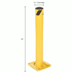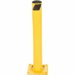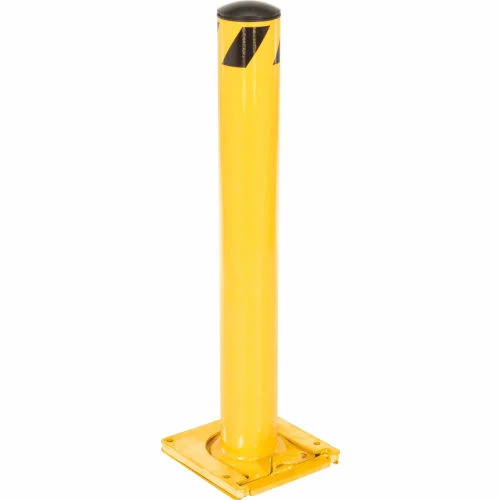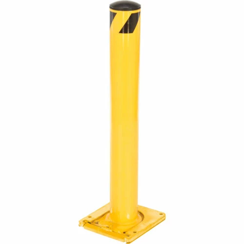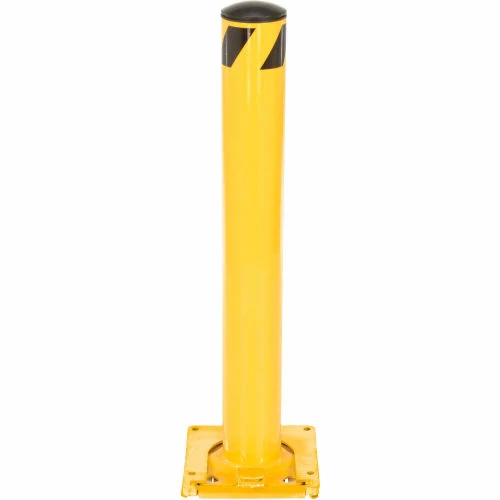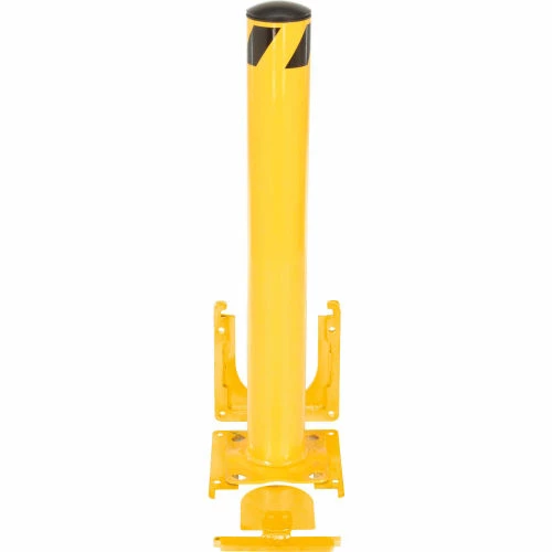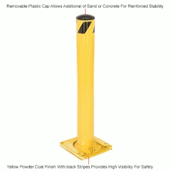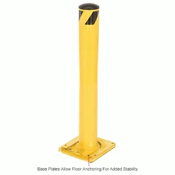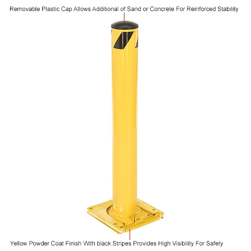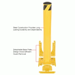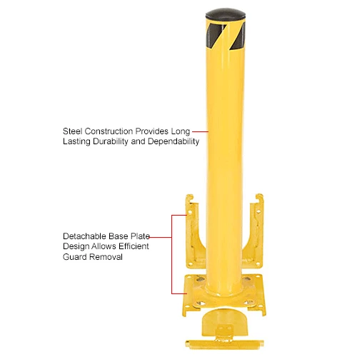 Steel safety bollards feature a detachable base plate design that allows quick and easy guard removal. Removable plates feature a pull-out side that allows the rack or bollard to slide out of mounted position temporarily to provide full access to machines, racks, loading docks, security areas and more. Detachable base features a padlockable hasp for security when in place (lock sold separately). Base plates allow floor anchoring for stability. Safety guards and bollards are made with heavy duty, welded steel. Safety yellow powder coat finish with black visibility stripes. Safety Bollards feature a removable plastic cap. 5-1/2? diameter steel tubing.