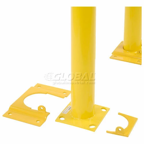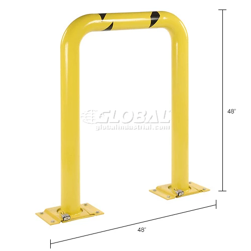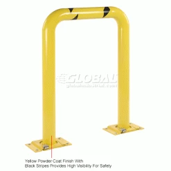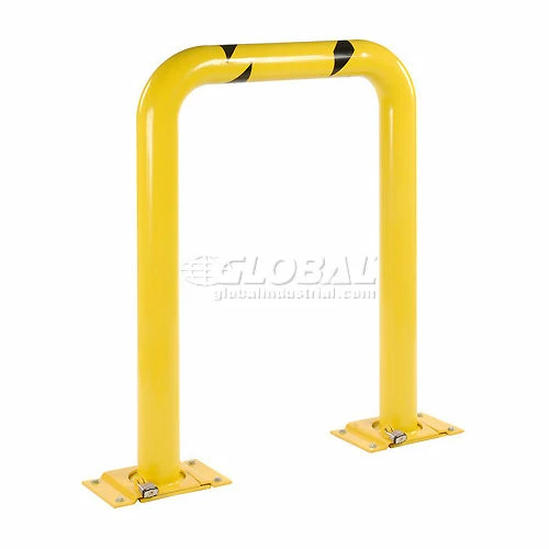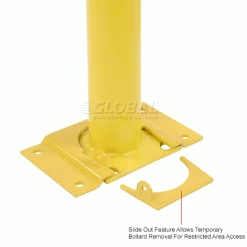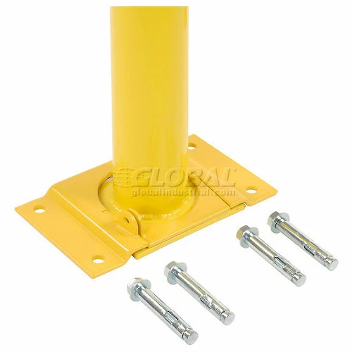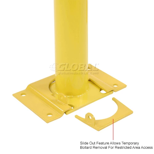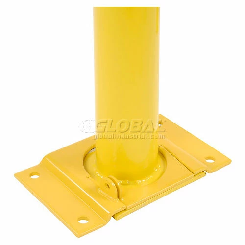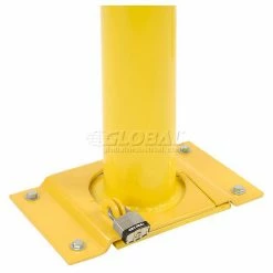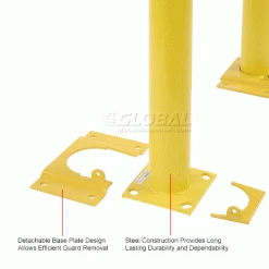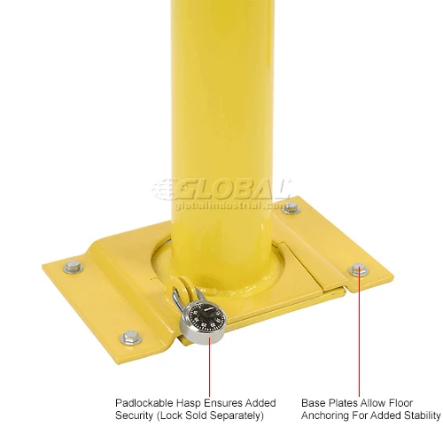 Steel safety guards feature a detachable base plate design that allows quick and easy guard removal. Removable plates feature a pull-out side that allows the rack or bollard to slide out of mounted position temporarily to provide full access to machines, racks, loading docks, security areas and more. Detachable base features a padlockable hasp for security when in place (lock sold separately). Base plates allow floor anchoring for stability. Safety guards are made with heavy duty, welded steel. Safety yellow powder coat finish with black visibility stripes.
