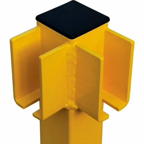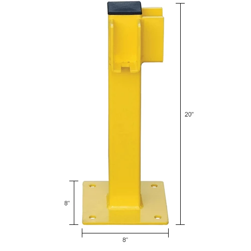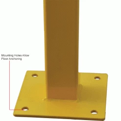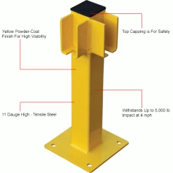 Lift-Out/Drop-In light duty guard rail system offers effective protection for machinery against forklift and pallet trucks, while providing temporary access or barrier protection for pedestrian control. Posts are constructed from 11-gauge steel with high visibility OSHA safety yellow powder coated finish. Ultra-durable construction with a 5,000 lb. impact rating at 4 mph. Posts include plastic cap for added protection and measure 3″ x 3″ with an 8″ x 8″ base plate that is 1/4″ steel thickness. Base plates feature 4 mounting holes for floor anchoring; anchor kit sold desperately, Model #652901.