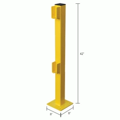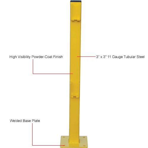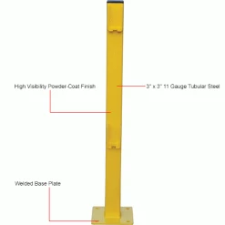 Lift-Out/Drop-In light duty guard rail system offers effective protection for machinery against forklift and pallet trucks, while providing temporary access or barrier protection for pedestrian control. Posts are constructed from 11-gauge steel with high visibility OSHA safety yellow powder coated finish. Ultra-durable construction with a 5,000 lb. impact rating at 4 mph. Posts include plastic cap for added protection and measure 3″ x 3″ with an 8″ x 8″ base plate that is 1/4″ steel thickness. Base plates feature 4 mounting holes for floor anchoring; The hole diameter is 16mm, 5/8″. anchor kit sold desperately, Model #652901.