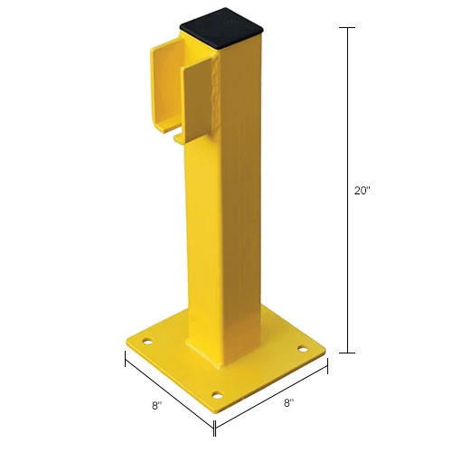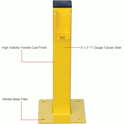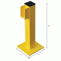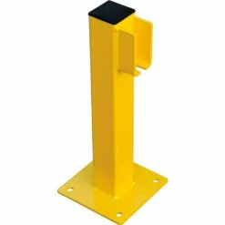 Lift-Out/Drop-In light duty guard rail system offers effective protection for machinery against forklift and pallet trucks, while providing temporary access or barrier protection for pedestrian control. Posts are constructed from 11-gauge steel with high visibility OSHA safety yellow powder coated finish. Ultra-durable construction with a 5,000 lb. impact rating at 4 mph. Posts include plastic cap for added protection and measure 3″ x 3″ with an 8″ x 8″ base plate that is 1/4″ steel thickness. Base plates feature 4 mounting holes for floor anchoring; anchor kit sold desperately, Model #652901.