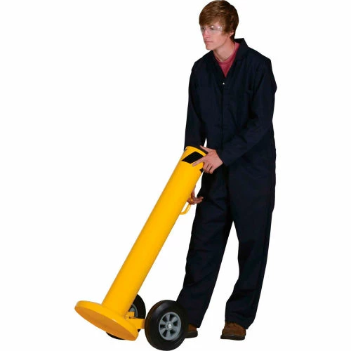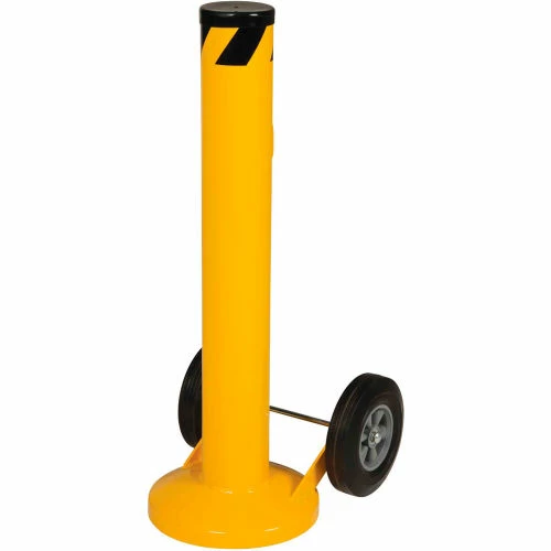 Movable Bollard provides a portable visual barrier when an area needs temporary protection. Ideal for use when keeping traffic out of a temporarily hazardous area or area under repair. Can be used indoors or outdoors. Mold-on-rubber wheels standard. Powder coated yellow for high visibility.