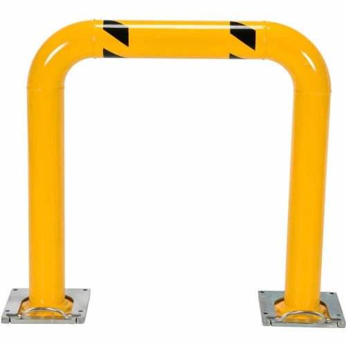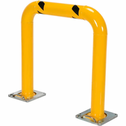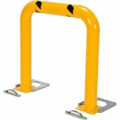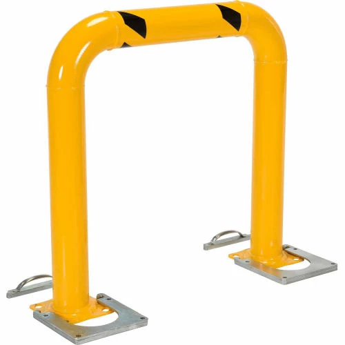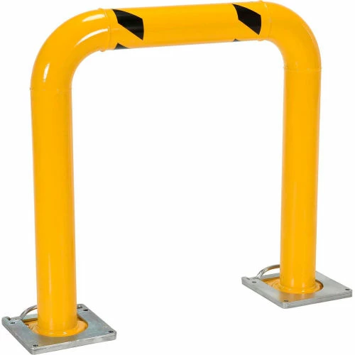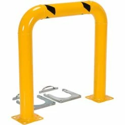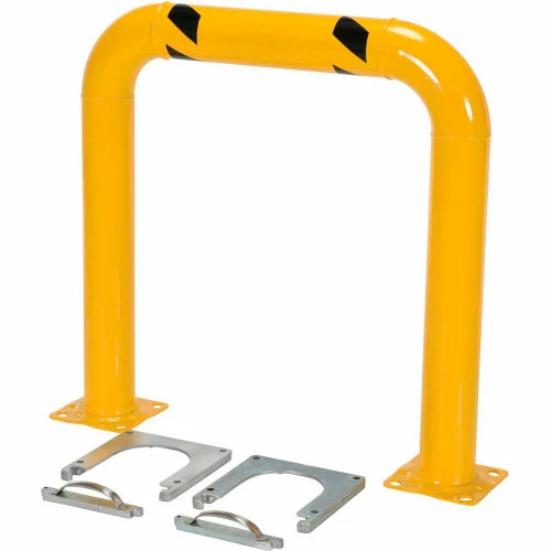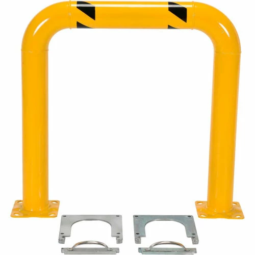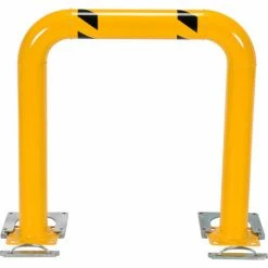 Removable plates feature a pull-out side that allows the rack or bollard to slide out of mounted position temporarily to provide full access to machines, racks, loading docks, security areas and more. Base plates measure 12-1/4″ x 12-1/4″ x 3/4″ thick and allow floor anchoring for stability. Safety machinery guards are made with heavy duty welded steel, 4-1/2″ diameter steel tubing. Safety yellow powder coat finish with black visibility stripes. Mounting kit sold separately. 42″H models include a 21″H mid-rail to comply with OSHA requirements.