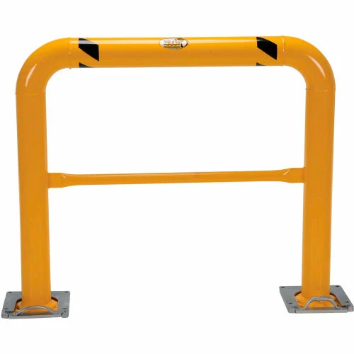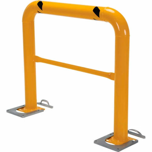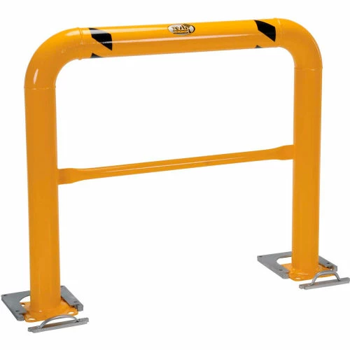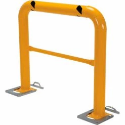 Removable plates feature a pull-out side that allows the rack or bollard to slide out of mounted position temporarily to provide full access to machines, racks, loading docks, security areas and more. Base plates measure 12-1/4″ x 12-1/4″ x 3/4″ thick and allow floor anchoring for stability. Safety machinery guards are made with heavy duty welded steel, 4-1/2″ diameter steel tubing. Safety yellow powder coat finish with black visibility stripes. Mounting kit sold separately.