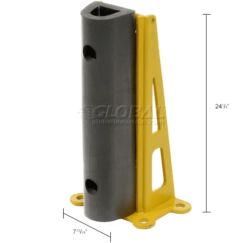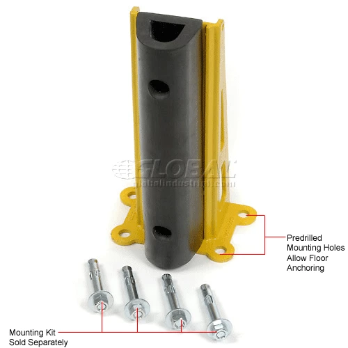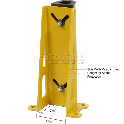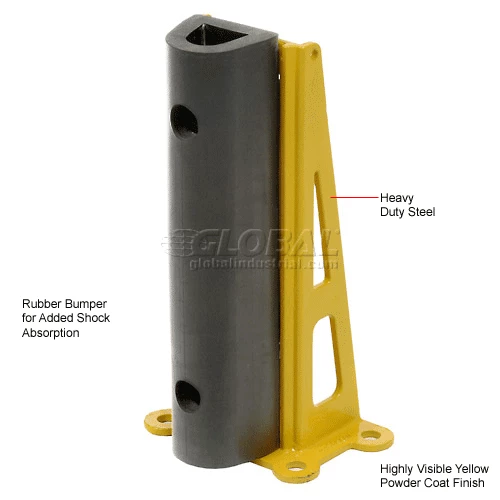 Steel rack guards avoid fork truck damage to valuable pallet rack uprights. These steel pallet rack guards help withstand impacts using sturdy, heavy-duty steel. Pallet rack protection guards have a high visibility yellow powder coat finish and 4 predrilled mounting holes for easy floor anchoring (hardware sold separately). Includes a rubber bumper to provide added impact and shock absorption. Bolt Diameter (in.) 3/4, Base Hole Size (in.) 7/8